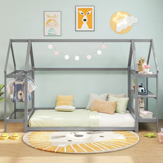 Twin Size Montessori Floor House Bed with Detachable Storage Shelves-Grey