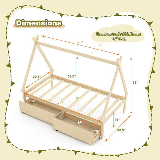 Twin Size Wooden Tent Platform House Bed with 2 Drawers-Gray
