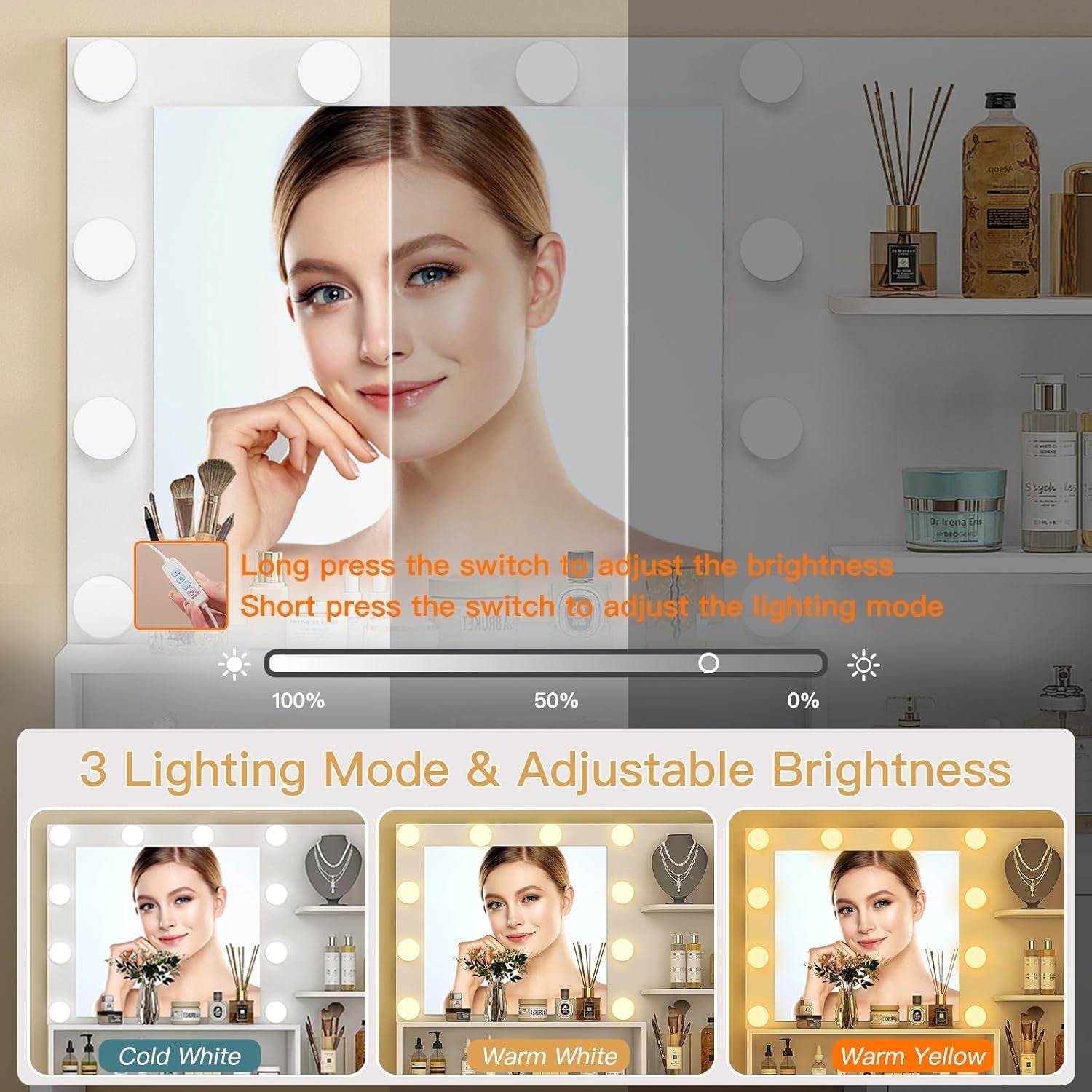 - 【3 Lighting Modes & Brightness Adjustable】 Hollywood lights recommended by professional makeup artists, with 3 modes, cold white, natural white and warm white options meet your different needs in different occasion. Brightness adjustable, evenly fill light from multiple angles, makeup has no dark corners and no shadows, and the details are clearer, which is every beautiful girl Must-have